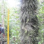 The trunk of a spiky palm tree (Bactris riparia) and the staff biologist of the Amazon Research Center, Andy Bicerra.